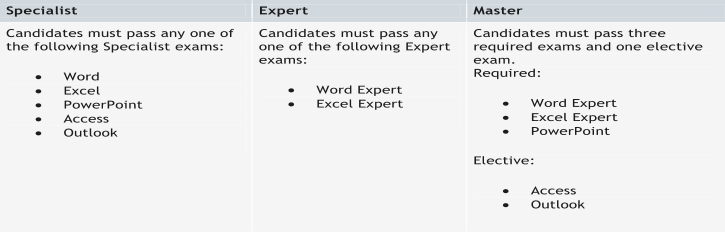 Master CertificationsThe Microsoft Office Specialist (MOS) Master certification helps demonstrate an individual's overall comprehension and expertise of Microsoft Office programs. Microsoft Office Specialist Masters have more than a working familiarity with Microsoft Office programs they are technically skilled to take advantage of the breadth of features efficiently and effectively.To earn the 2010 Microsoft Office Master certification, you must pass the following MOS exams:MOS: Microsoft Office Word 2010 ExpertMOS: Microsoft Office Excel 2010 ExpertMOS: Microsoft Office PowerPoint 2010 MOS: Microsoft Office Outlook 2010 or MOS Microsoft Office Access 2010